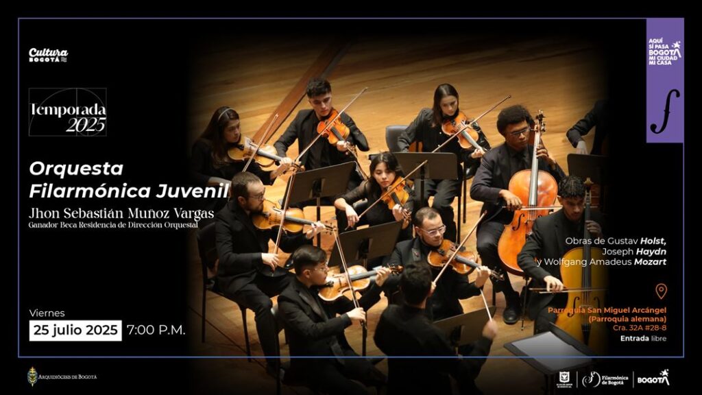 ¡Bogotá, mi Ciudad, mi Casa’ es cultura y música! Invitación para asistir a los dos conciertos gratis de la Orquesta Filarmónica de Bogotá (OFB) , con obras de Mozart, Haydn, Holst, Martinů y Enescu, la primera jornada será este viernes 25 de julio de 2025 en la Parroquia San Miguel Arcángel a las 7:00 p. m. y la segunda será en el Museo de Arte Moderno de Bogotá – Mambo, el domingo 27 de julio a las 11:00 a. m. ¡Ambos conciertos son con entrada libre hasta completar aforo!